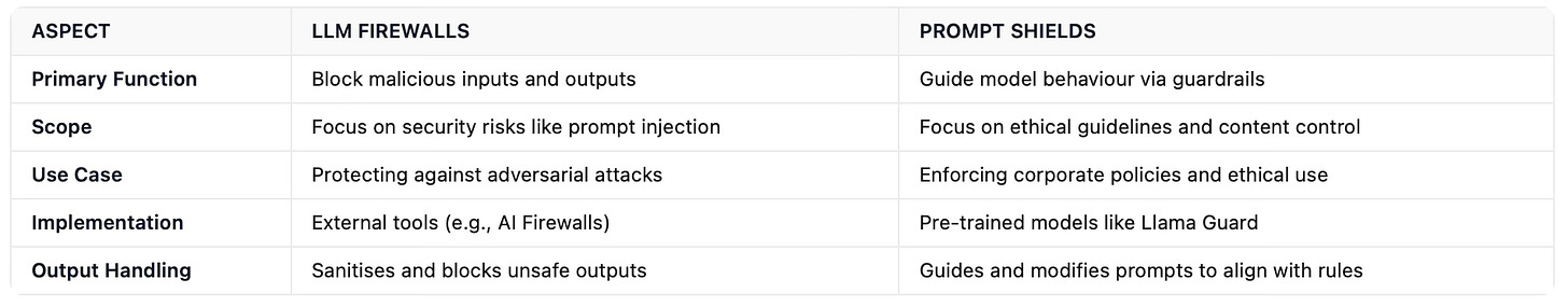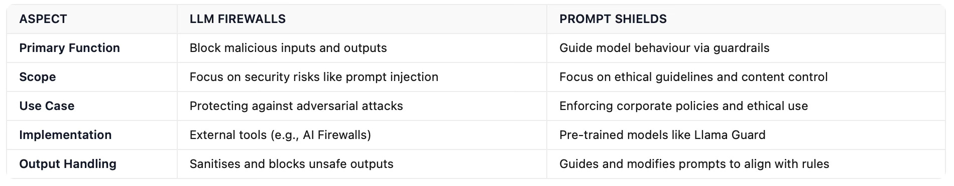 Prompt Shields, such as Llama Guard, are tools designed to guide the behaviour of LLMs by modifying or restricting the prompts they receive. Unlike firewalls, which focus on blocking malicious inputs, Prompt Shields aim to ensure that the model’s outputs align with ethical guidelines and corporate policies. They operate by: